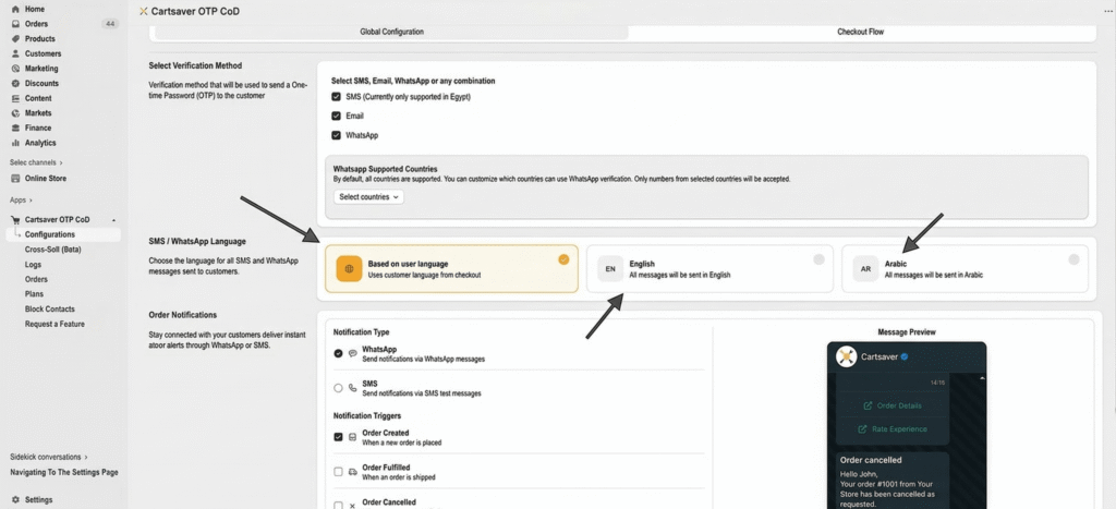 - Language Intelligence (English & Arabic): As seen in the Global Configuration, Cartsaver can automatically detect the customer’s language. Sending a confirmation message in the customer’s native tongue is a proven way to increase verification rates in regions like Egypt and the GCC.