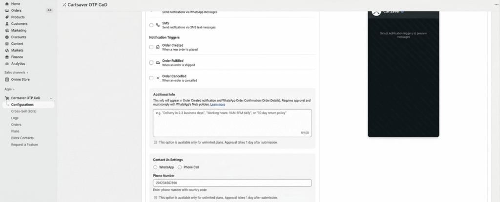 What if a customer has a question about their COD order? Cartsaver allows you to embed a Contact Us button directly in the WhatsApp flow. You can choose: